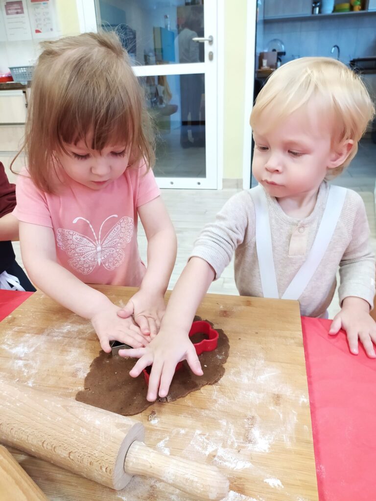 Święta zbliżają się wielkimi krokami dlatego czas już na pieczenie pierniczków. W naszym żłobku od rana unosił się wspaniały aromat korzennych przypraw. Dzieci wyrabiały ciasto, wałkowały i wykrawały pierniczki przy pomocy foremek. Po upieczeniu dekorowały je lukrem i barwnymi posypkami.